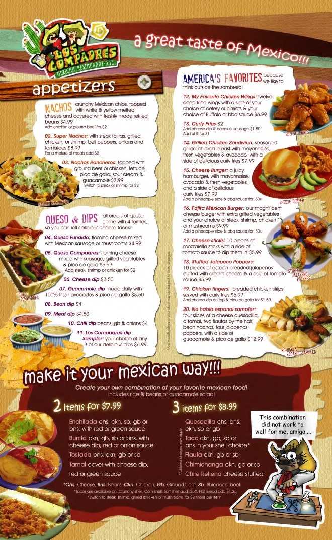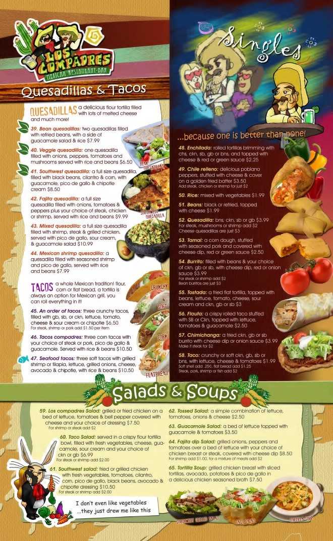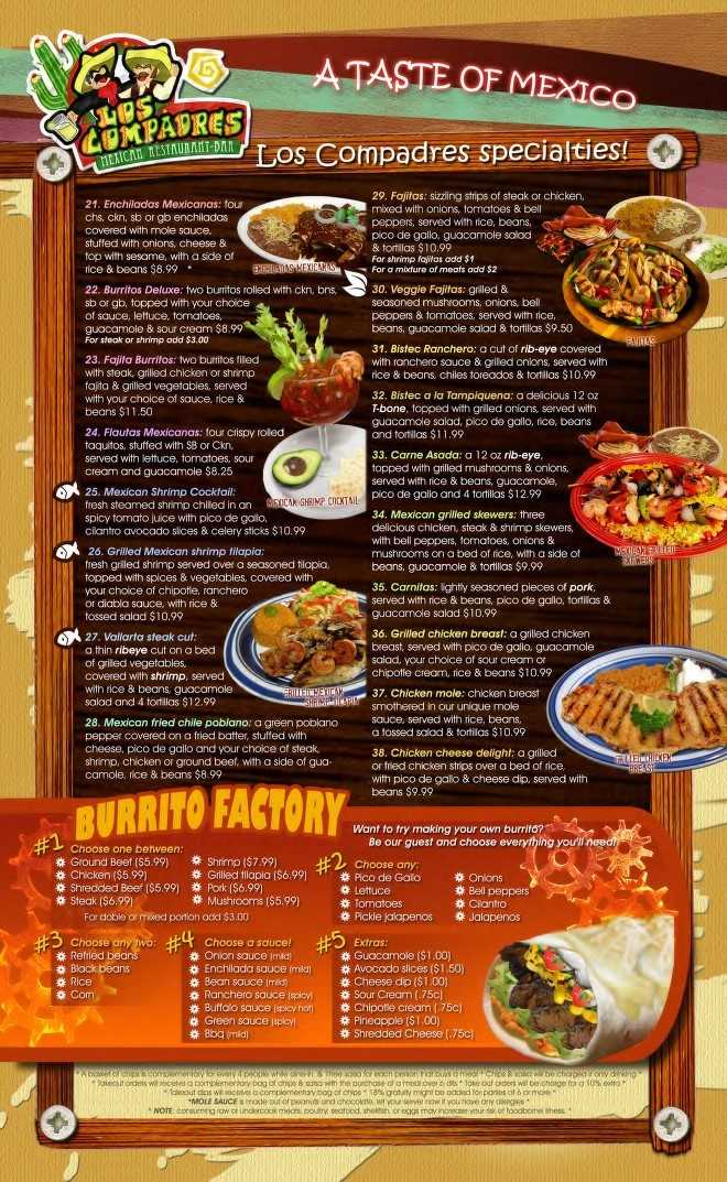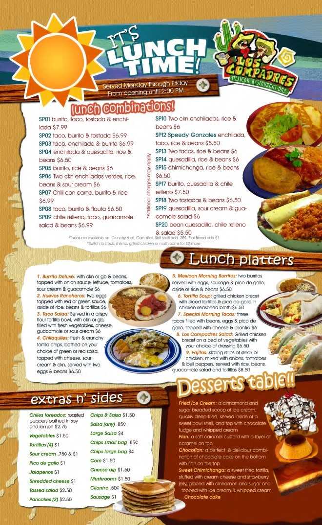 Sunday: 12:00 AM - 21:30 PM Monday: 11:00 AM - 10:00 PM Tuesday: 11:00 AM - 10:00 PM Wednesday: 11:00 AM - 10:00 PM Thursday: 11:00 AM - 10:00 PM Friday: 11:00 AM - 11:00 PM Saturday: 12:00 AM - 11:00 PM Specials Everyday Frozen margaritas, regular margaritas, draft beer and house shots are 1/2 Monday thru Friday (11pm to 2pm) Lunch Menu Monday Buy one burrito a la carte, get second for 1 dll Tuesday Quesadillas 1.99